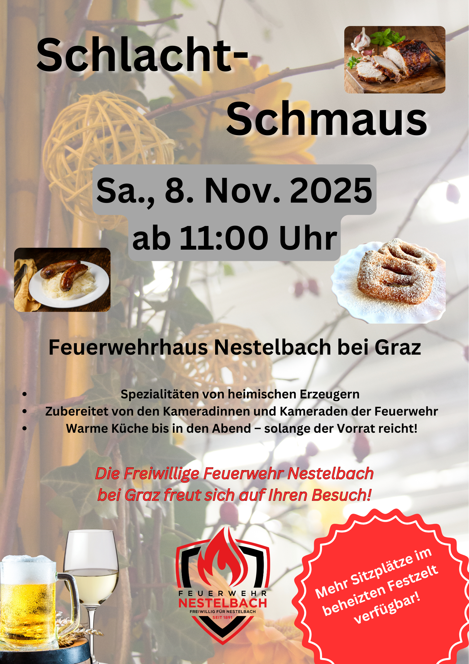 Am Samstag den 08.11.2025 mit Beginn ab 11:00 Uhr veranstaltet die FF Nestelbach bei Graz, wieder ihren Schlachtschmaus beim Feuerwehrhaus Nestelbach bei Graz.